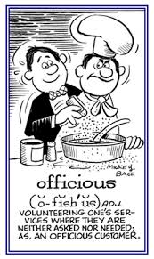 - 1560s, "zealous, eager to serve," from Latin officiosus "full of courtesy, dutiful, obliging," from officium "duty, service" (see office). Sense of "meddlesome, doing more than is asked or required" had emerged by 1600 (in officiously). An officious lie (1570s) is one told to do good to another person (from Latin mendocium officiosum or French mensonge officieux). Related: Officiousness.