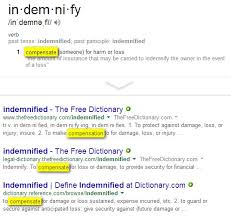 - "compensate for loss or expense," 1610s, from Latin indemnis "unhurt" (see indemnity) + -fy. Related: Indemnified; indemnifying.