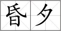 昏 : 昏hūn天刚黑的时候:黄昏。昏晓(朝夕。亦指明暗)。昏定晨省(x媙g )(人子侍奉父母的日常礼节?