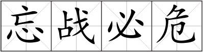 忘战必危 [wàng zhàn bì wēi]战:战备。危:危险,危机。国虽大,好战必亡,天下虽平,忘记了战备就一定会产生危机。Www.WEntiYI.cOm