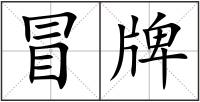 挨牌 捱牌 竹牌 纸牌 正牌 主牌 贞节牌坊 诈冒 闸牌子 占冒 砸牌子 云牌 月份牌 玉项牌 远乡牌 招牌 鱼牌 欝冒 玉牌 郁冒 韵牌 酉牌时分 遮箭牌 硬牌 遮冒 隐冒 摘牌 银牌 印牌 银牌馆 迎风冒雪 酉字牌 衣牌 杂牌 腰牌 杂牌军 叶子牌 掩冒 佯风诈冒 验牌 烟月牌 牙牌 燕尾牌 押牌宝 亚牌 亚字牌 髹牌 眩冒 虚冒 衒冒 宣牌 信牌 行牌 行香挂牌 歇息牌 小牌 香位牌 象牙牌 宪牌 洗牌 袭冒 檄牌 衔牌 象牌 诬冒 下马牌 未牌 帷冒 王牌 王明“左”倾冒险主义 罔冒 亡人牌 伪冒 顽冒 猥冒 万民牌伞 外汇牌价 团牌