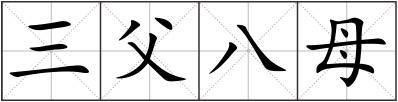 三父八母 [sān fù bā mǔ]旧指同居继父、不同居继父、从继母改嫁之继父,合称三父;嫡母、继母、养母、慈母、嫁母、出母、庶母、乳母,合称八母。