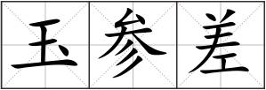 参差 : 1.不齐貌。 2.纷纭繁杂。 3.蹉跎;错过。 4.远离;阻隔。 5.差不多;几乎。 6.很快;顷刻。 7.不一致;矛盾。 8.差池;差错。 9.古代乐器名。洞箫,即无底的排箫。亦名笙。相传为舜造,象凤翼参差不齐。