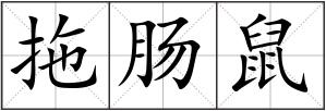 1.即唐鼠。以腹边有余物如肠,故名。相传"昔仙人唐昉拔宅升天,鸡犬皆去,唯鼠坠下不死,而肠出数寸,三年易之。俗呼为唐鼠,城固川中有之。"见南朝宋刘敬叔《异苑》卷三。后以"拖肠鼠"喻依然故我不能有所作为的人。宋王禹偁《谪居感事》诗:"兀兀拖肠鼠,悠悠曳尾。"清钱谦益《张藐姑太仆许饷名酒叠前韵奉简》:"郎当自笑拖肠鼠,角逐闲看食叶蚕。"亦省作"拖肠"。喻不能变易,依然故我。wWW.WENTiyi.CoM