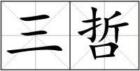 《汉书·叙传下》:“ 陈汤 诞节,救在三悊。” 颜师古 注引 郑氏 曰:“三悊,谓 刘向 、 谷永 、 耿育 ,皆讼救 汤 也。”《文选·陆机<答贾长渊>诗》:“乃眷三哲,俾乂斯民。” 李善 注:“三哲, 刘备 、 孙权 、 曹操 也。” 南朝 宋 谢庄 《求贤表》:“ 成子 举三哲而身致 魏 辅; 应侯 任二士而己捐 秦 相。”《北史·王遵业传》:“ 遵业 有誉当时,与中书令 陈郡 袁翻 、尚书 琅邪 王诵 并领黄门郎,号曰三哲。”