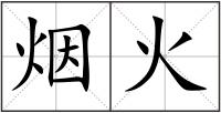 ①炊烟。借指住户人家:狗吠鸡鸣,烟火稠密。 ②犹烽火。边境有入侵:北边又起烟火。 ③指熟食:不食人间烟火。 ④指后代继承者:四时祭扫,烟火不绝。 ⑤也作“焰火”。烟火剂燃放时所发出的各种颜色的火花,有时即指烟火剂本身。有平地小烟火和空中大烟火两类。一般系包扎品,内装药剂。点燃后烟火喷射,呈各种颜色,并幻成各种景象。始于宋代。今又称“礼花”,为节日所常用。