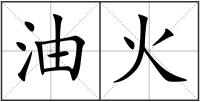 油 : 油yóu动植物体内所含的脂肪或矿产的碳氢化合物的混和液体,一般不溶于水,容易燃烧:油饼。油布。