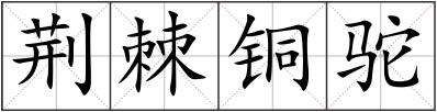荆棘铜驼 [jīng jí tóng tuó]铜驼:铜制的骆驼,古代置于宫门外。形容国土沦陷后残破的景象。