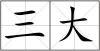 大 : 大dà指面积、体积、容量、数量、强度、力量超过一般或超过所比较的对象,与“小”相对:大厅。大?