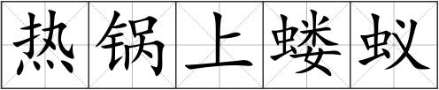 热锅上蝼蚁 [rè guō shàng lóu yǐ]形容心里烦躁、焦急,坐立不安的样子。同“热锅上蚂蚁”。