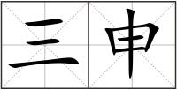 申 : 申shēn地支的第九位,属猴。用于记时:申时(下午三点至五点)。陈述,说明:申述。申斥。申辩?