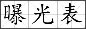 曝光表 [bào guāng biǎo]一种测量光线强度的仪表。摄影时用以确定摄影机的光圏大小和曝光时间。