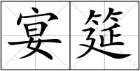 宴 : 宴yàn以酒饭款待宾客:宴客。宴饮。宴席。聚会在一起吃酒饭:宴会。宴集。酒席:设宴。国宴。盛