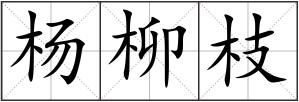 柳枝 : 1.柳树的枝条。 2.古乐府曲调名。又称《杨柳枝》。 3.词调名。又称《杨柳枝》。盖由乐府横吹曲《折扬柳》演变而来。有三体:(1)单调,二十八字,四句,句七字。平韵。形似七言绝句,声律较灵活,平仄不拘定。前蜀牛峤《柳枝》词五首即用此调。(2)双调,四十字。上﹑下片各以七﹑三﹑七﹑三字为句。平韵。前蜀张泌《柳枝》词即三﹑七﹑三字为句,共三十二实字;另在第一﹑二﹑四句之下各加和声(亦称"和歌")"柳枝",共十二虚字,合为四十四字。参阅清万树《词律》卷一。 4.词曲歌唱时的和声,无义。 5.侍姬名。唐韩愈侍姬之名。 6.侍姬名。唐白居易侍姬小蛮善舞,腰似柳枝,樊素善歌《杨柳枝》,因以为两人的昵称。