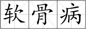 1.成年人的骨质软化症,由缺乏维生素D或由胃肠疾患使钙和磷的新陈代谢发生障碍引起。症状是背部和下肢疼痛,严重时发生畸形或骨折。患者多为妇女。 2.婴幼儿易得的一种病。多由缺乏维生素D,肠道吸收钙﹑磷的能力降低引起。症状是头大,鸡胸,驼背,两腿弯曲,腹部膨大,发育迟缓。也叫佝偻病。 3.比喻人态度不坚定,没有骨气,遇到压力就动摇。