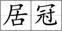 冠 : 冠guān帽子:衣冠。冠戴。冠盖(古代官吏的帽子和车盖,借指官吏)。衣冠楚楚。形状像帽子或在顶