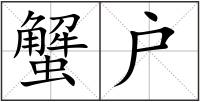 蟹 : 蟹xiè〔螃蟹〕节肢动物,水陆两栖。全身有甲壳,足有五对,前双足成钳状,称“螯”,横着爬。腹?