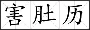亦作“害肚歷 ”。宋 制,馆阁官员每夜轮一人值宿,如因故不能值宿,则于名下写上“肠肚不安”,故馆阁宿历(值宿登记本)相传谓“害肚历”。