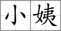 姨 : 姨yí称母亲的姊妹:姨母。姨妈。姨父。妻的姊妹:大姨子。小姨子。妾:姨太太。笔画数:9;?
