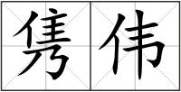 宋 王安石 《谢孙龙图启》:“矧势位之尊严,加功名之隽伟,天子之所倚重,士人之所取平,敢干冒进之诛,自废退藏之守。” 明 谢榛 《四溟诗话》卷二:“譬诸诗,发言平易而循乎绳墨,法之正也。发言雋伟而不拘乎绳墨,法之奇也。”