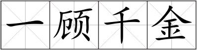 一顾千金 [yī gù qiān jīn]顾:看。古之善于相马者伯乐看了马一眼,良马的身价便值千金。比喻得到贤者的推荐而使人或事物身价倍增。