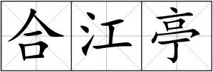 1.古迹名。为唐人宴饯题咏之所。(1)在今湖南衡阳县北。唐韩愈有《合江亭》诗。孙汝听题解:"亭在衡州负郭,今之石鼓头,即其地也。地形特异,岿然崛起于二水之间,旁有朱陵洞,亦谓之朱陵仙府,唐人题刻散满岩上。"(2)在今湖北宜都县北。宋孙光宪《北梦琐言》卷三:"唐路侍中岩……以官妓行云等十人侍宴,移镇渚宫日,于合江亭离筵赠行云等《感恩多》词,有"离魂何处断?烟雨江南岸。"至今播于倡楼也。"(3)在今四川成都市东南。传为唐韦皋建。参阅宋吕大防《杜工部年谱》。