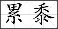 累 : 累léi〔累累〕a.连续成串,如“果实累累”;b.颓丧的样子,如“累累若丧家之犬”。〔累赘〕a.多?