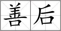 善后 [shàn hòu]谓妥善处理事情发生后的遗留问题。语出《孙子·作战》:“夫钝兵挫鋭,屈力殫货,则诸侯乘其弊而起,虽有智者,不能善其后矣。”宋 李纲 《与秦相公书》:“今併与 岳飞 一军,徙屯他路,则某区区愚见,不知所以善后矣。”清 魏源 《圣武记》卷十:“川 、陕 、楚 军务将竣,其善后事宜,莫若扼形势为控制。”罗义俊 《南市难民述略》:“南市难民区至此结束……确定善后事务委托 雅斯帕尔 等三人负责。”