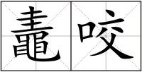 咬 : 咬yǎo上下牙对住,压碎或夹住东西:咬啮。咬噬。咬紧牙关。钳子等夹住或螺丝齿轮等卡住:咬合。?