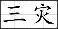 三灾 [sān zāi]佛教谓劫末所起的三种灾害。刀兵、疫疠、饥馑为小三灾,起于住劫中减劫之末;火、风、水为大三灾,起于坏劫之末。见《俱舍论·分别世品》。亦泛指灾难。
