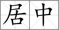 ①在中间;居间:~调停 ㄧ~斡旋。 ②当中:两旁是对联,~是一幅山水画。