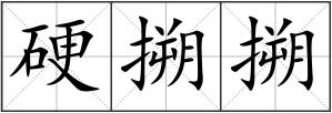 硬开头的相关词语:硬邦邦 硬帮帮 硬梆梆 硬棒棒 硬绷绷 硬蹦蹦 硬触触 硬打捱 硬打挣 硬功夫 硬古古 硬骨头 硬拐拐 硬广告 硬汉子 硬环境 硬撅撅 硬倔倔 硬蹶蹶 硬碰硬 硬翘翘 硬生生 硬铁汉 硬通货 硬叶林 硬挣挣 硬挣子 硬铮铮 硬正气 硬支杀 硬纸板 硬指标 硬搬 硬帮 硬梆 硬棒