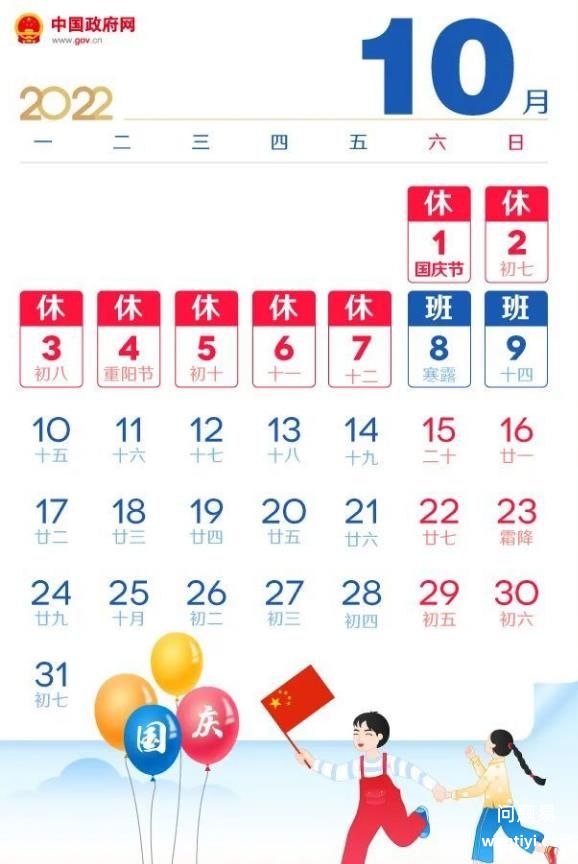 10月1日至7日放假调休,共7天。10月8日(星期六)、10月9日(星期日)上班。
