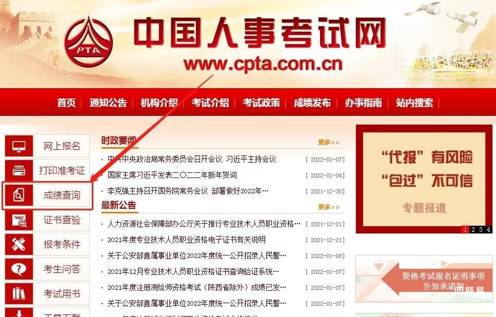 1、登陆中国人事考试网,单击左侧成绩查询按钮。