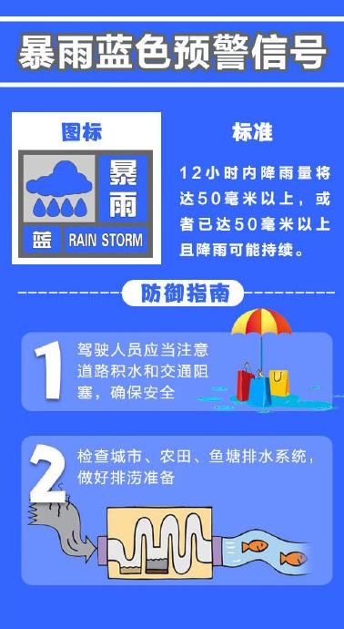 暴雨蓝色预警:12小时内降雨量将达50毫米以上,或者已达50毫米以上且降雨可能持续。
