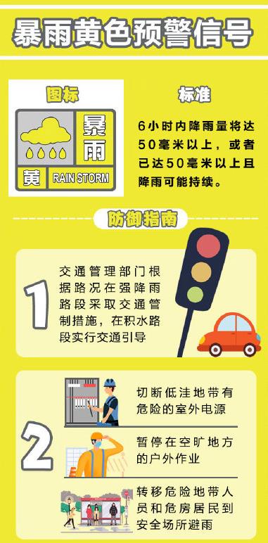 暴雨黄色预警信号: 6小时内降雨量将达50毫米以上,或者已达50毫米以上且降雨可能持续。