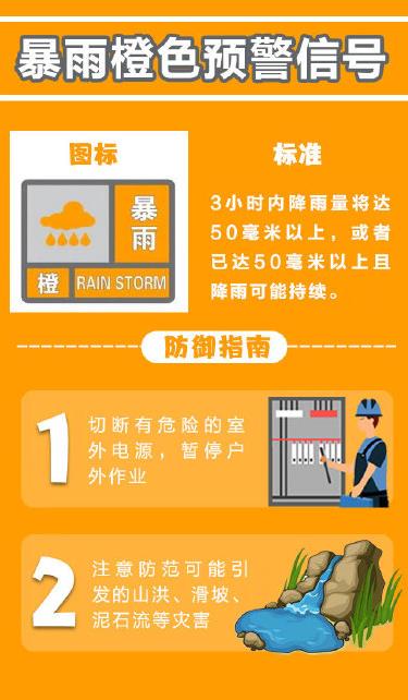 暴雨橙色预警信号: 3小时内降雨量将达50毫米以上,或者已达50毫米以上且降雨可能持续。