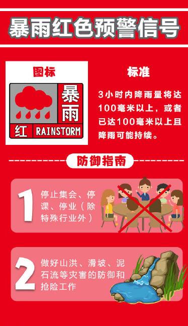 暴雨红色预警信号: 3小时内降雨量将达100毫米以上,或者已达100毫米以上且降雨可能持续。