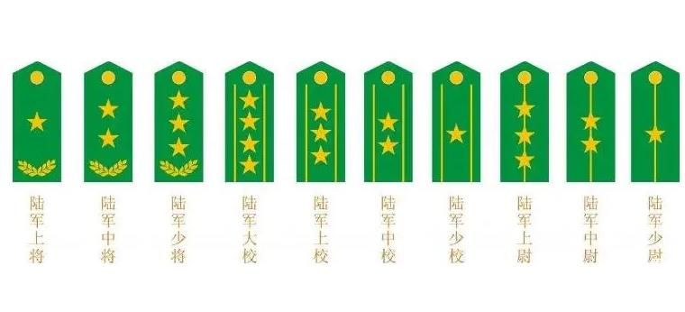 军衔通常都是体现在肩膀上的肩章上。其中将官的肩章上嵌有金枝和金星,金星的数量代表了等级,三个、两个、一个金星分别代表了上、中、少三个将官。而校官和尉官则是由星徽和杠代表。