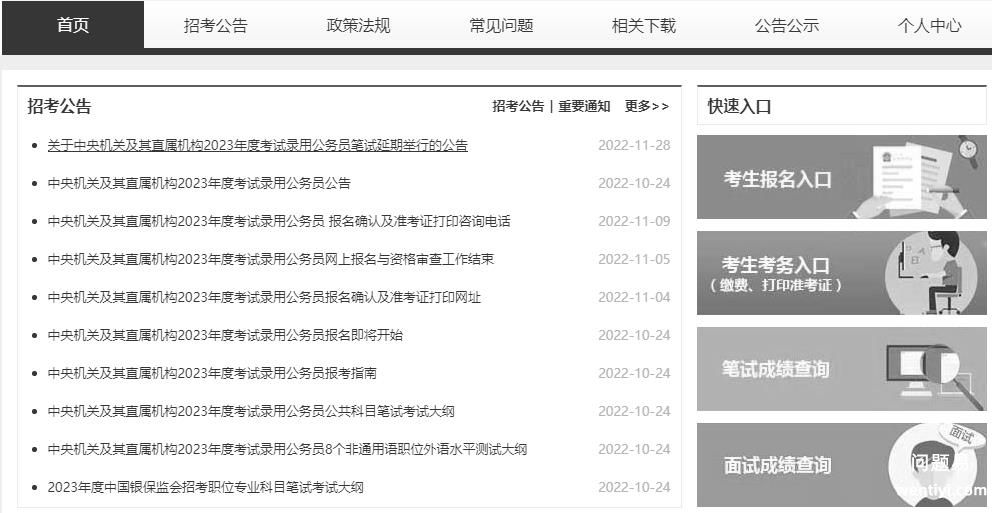 1、每年有一次国家公务员考试,考试在11月底或12月初,公告发布在10月中下旬。