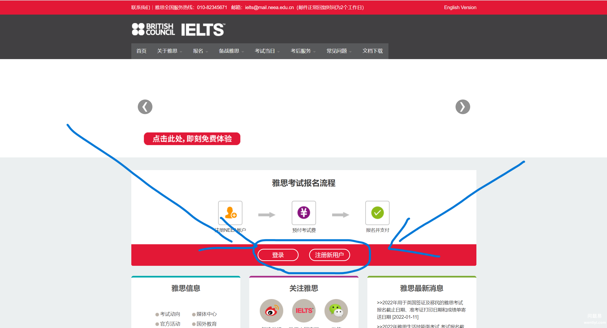 第一步雅思报名网站【雅思网上报名-教育部教育考试院】:点击下方“注册新用户”