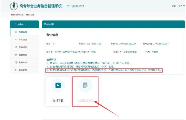 1.考生须在规定时间内凭考籍号、身份证号、密码和动态口令卡登录志愿填报服务系统(gkzy.jseea.cn)填报征求志愿,并对自己所填报信息的真实性和准确性负责,不需要现场签字确认志愿信息。2.如下图所示,登录志愿填报服务系统后,点击志愿正式填报图标,选择填报批次;