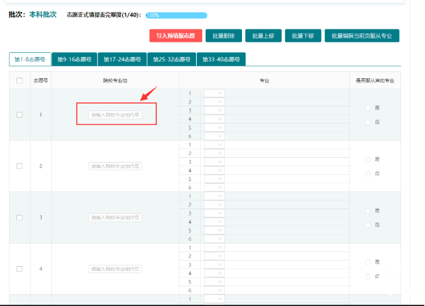 3.对照省教育考试院官网(www.jseea.cn)或“江苏招生考试”微信公众号发布的征求志愿计划,在填报页面手工输入院校专业组代号,并选择专业。