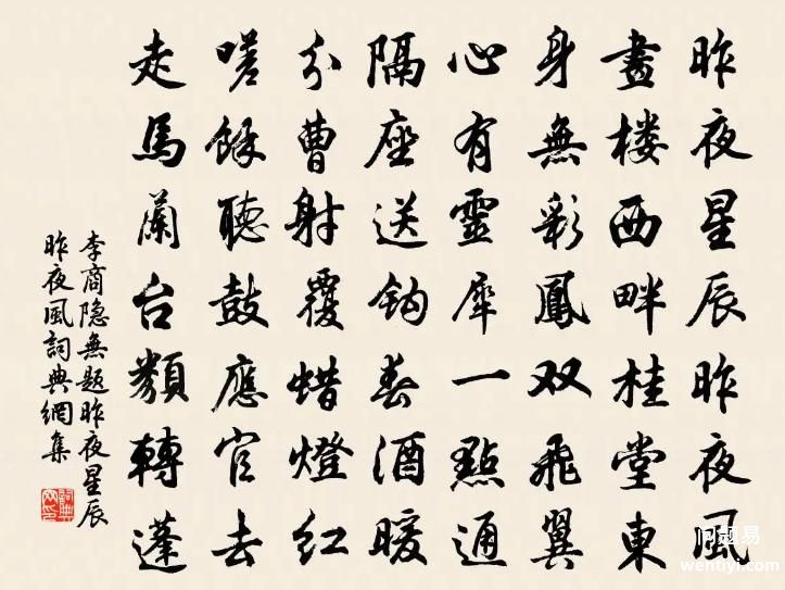 《无题·昨夜星辰昨夜风》表达了诗人心中对其不能与恋人长相厮守的悲哀,也抒发了诗人对身世飘零的感慨。全诗细腻地描绘了身处恋爱中的人们的微妙心态,表现出恋人们之间深切的相思之情,流露出一种寂寥哀婉的情绪。