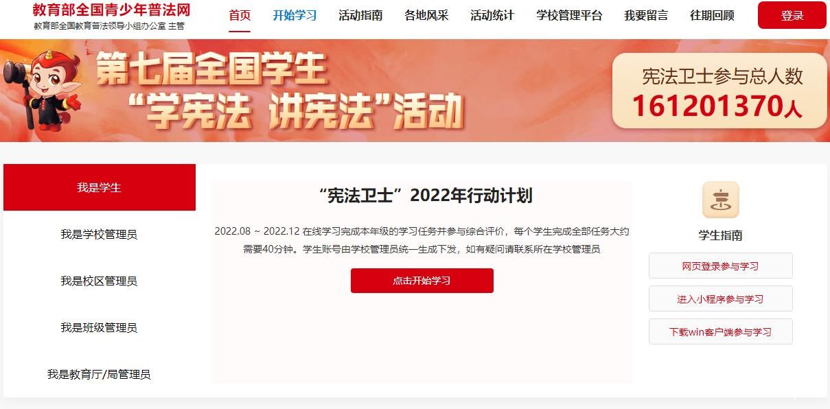 第七届全国学生“学宪法 讲宪法”活动火热进行中!同学们可通过普法网“宪法活动”专栏、“青少年普法”小程序,或下载“宪法活动”windows客户端参与“宪法卫士”行动计划在线学习。