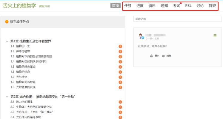 进入课程后,可查看章节列表的知识点,右上角为学习导航,可即时收到老师发布的学习任务、测验、作业及考试,查看自己的学习进度,并进行资料中的拓展学习,也可参与讨论、提问等。