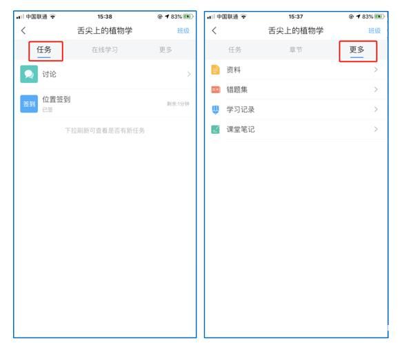 此外,点击“任务”,可查看老师发放的学习任务及各类通知,点击“更多”可查看老师准备的学习资料和这门课程的个人错题集。