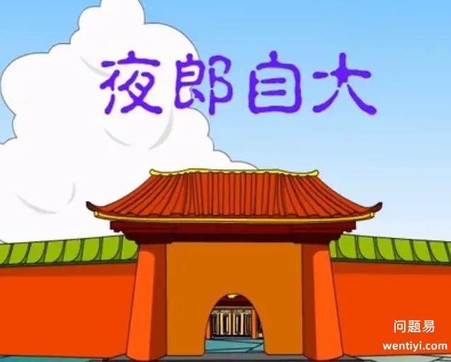 有一天,夜郎国国王与部下巡视国境的时候,他指着前方问说:这里哪个国家最大呀?”部下们为了迎合国王的心意,于是就说:当然是夜郎国最大啰!”走着走着,国王又抬起头来、望着前方的高山问说:天底下还有比这座山更高的山吗?”部下们回答说:天底下没有比这座山更高的山了。”