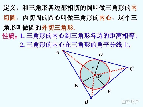 与三角形三边都相切的圆叫做三角形的内切圆,圆心叫做三角形的内心,三角形叫做圆的外切三角形,三角形的内心是三角形三条角平分线的交点。